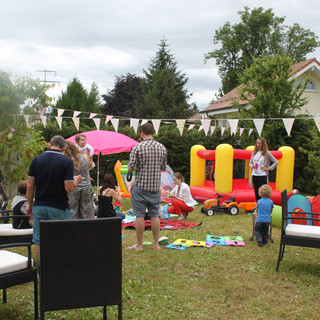A busy day (again) with an earlyish start. By 8.15am Ash and I were on our way to Divonne to the Carrefour to shop for Chloe´’s birthday party food. By 10.30am we were back and it was ‘all hands to the tiller’. To be fair those left behind had been setting the garden out for a one year olds birthday party; bouncy castle, sand pit, pool and water toys etc. Then it was food preparation. By just before midday the first guest arrived and by 1.00pm it was busy. Much playing, drinking, chatting, eating and ‘Happy Birthday-ing’ followed in warm, but overcast, weather. By just after 3.00pm it started to rain which, while not hard, was enough to encourage one or two to leave while the hardy ones sat under umbrellas. Then, all too soon, it was time to clear the garden. Chloé was a real angel and all present enjoyed themselves. Bath-time followed for the birthday girl while the rest of us sat and relaxed with a drink.